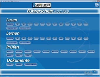 Europa-Führerschein 2008/2009 ist in drei Module aufgeteilt. Das erste Modul Lesen gibt dem angehenden Führerscheinbesitzer Antworten auf alle amtlichen Prüfungsfragen. In Modul Nummer zwei Lernen gibt man die Antworten selbst. Die Software korrigiert die Eingaben des Schülers.
