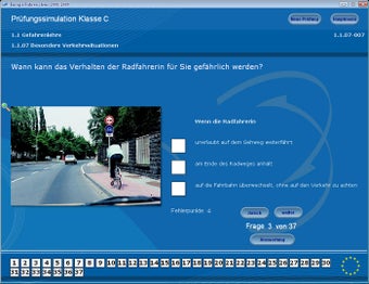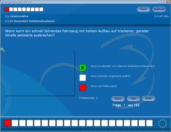 Das dritte Modul Prüfen simuliert eine Prüfungssituation. Aus allen möglichen Fragen stellt Europa-Führerschein 2008/2009 gemäß den offiziellen Prüfungsrichtlinien eine theoretische Führerscheinprüfung zusammen. Zusätzlich bringt die Software den Bußgeld- und Punktekatalog, die Straßenverkehrsordnung sowie die Prüfungsrichtlinien als Dokumente mit.